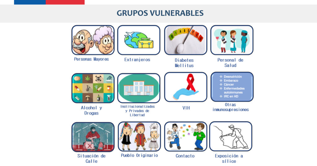 Los síntomas más comunes de la enfermedad son: Baja de peso importante (generalmente 7 kilos o más), tos con flema o sangre, fiebre y sudoración nocturna. Además, se debe considerar que existen personas que tienen mayor probabilidad de enfermar, que son aquellas que poseen alguna condición de vulnerabilidad y/o padece una enfermedad que le comprometa su sistema inmunitario, ver imagen izquierda.